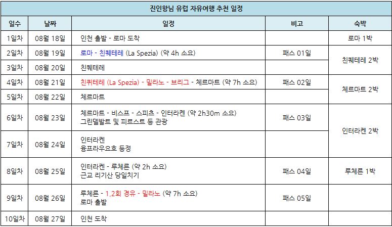 문의 주신 일정에 맞춰 정리한 표와 함께 유레일 패스 추천 드리겠습니다