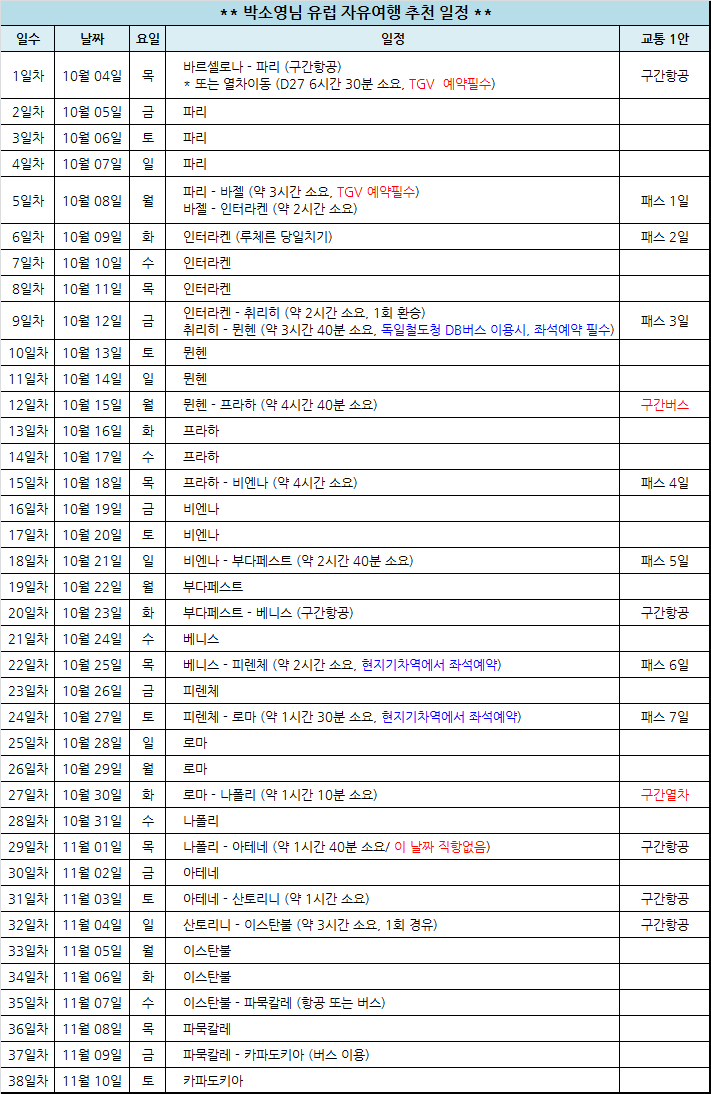 여행전 한국에서 예약하셔야하는 구간은 빨간 색 현지에서 예약하실 수 있는 구간은 파랑색입니다.