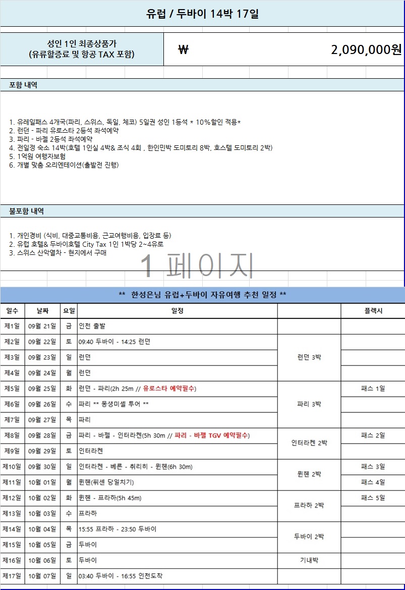 안녕하세요^^ 요청주신 9월 유럼/두바이 자유여행 견적 보내드립니다!