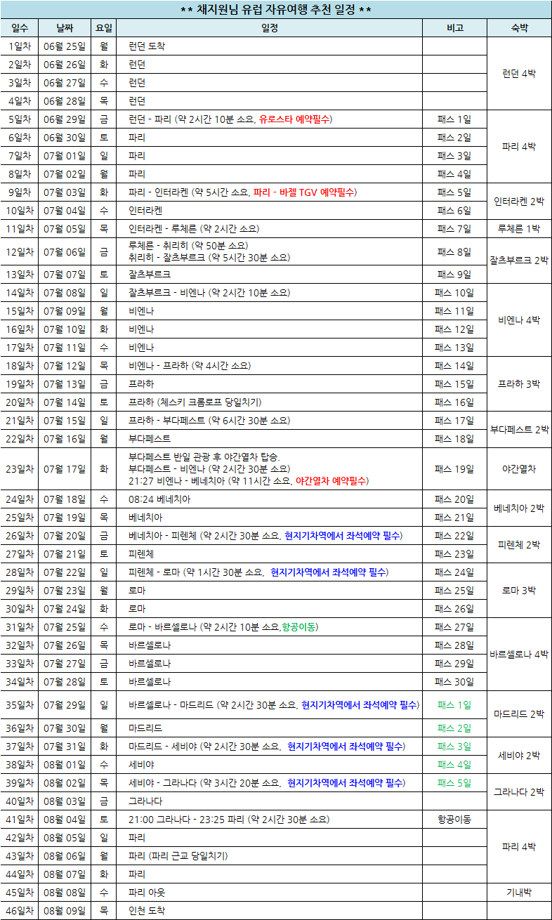 여행전 한국에서 예약하셔야하는 구간은 빨간 색 현지에서 예약하실 수 있는 구간은 파랑색입니다.