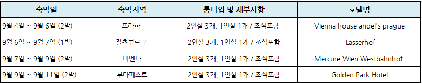 추가로 문의주신 동유럽 여행 숙박 관련해서 표로 정리해서 안내 드리겠습니다!