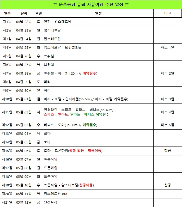 초록색구간은 현지에서 예약하셔도 괜찮습니다!
